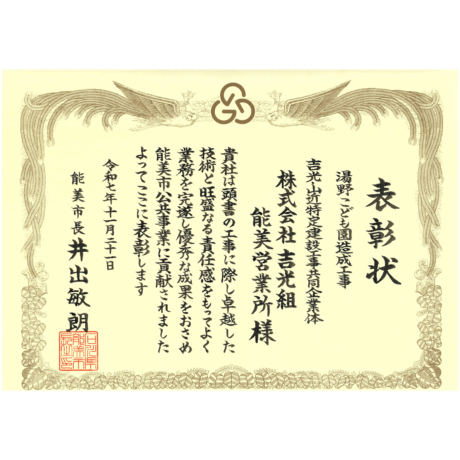 9月30日に小松市役所にて『小松市建設工事表彰式』が執り行われ、10月21日の全体朝礼にて、頂いた表彰状が全社員に披露されました。
