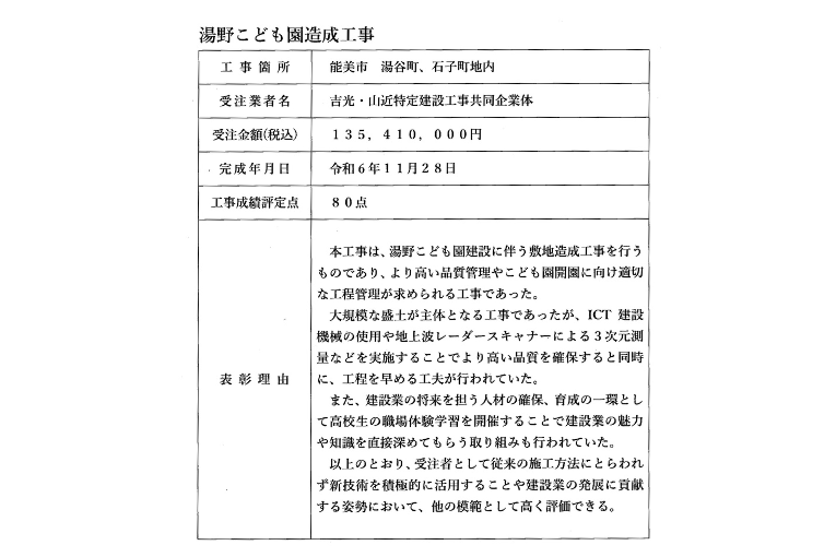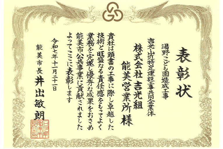 能美市より優良建設工事として表彰されました 2025/11/29 11月21日に能美市役所にて行われた能美市建設工事表彰式で、 当社が施工させて頂いた『湯野こども園造成工事(土木)』について、優良建設工事として表彰されました。
